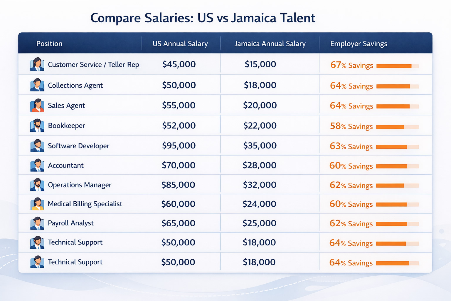 Caribbean HR Solutions helps companies significantly reduce hiring and operating expenses through nearshore workforce solutions. With team augmentation services in customer service, bookkeeping, creative support, and more, businesses save up to 70% in labor costs compared to U.S. hiring—without sacrificing service quality.